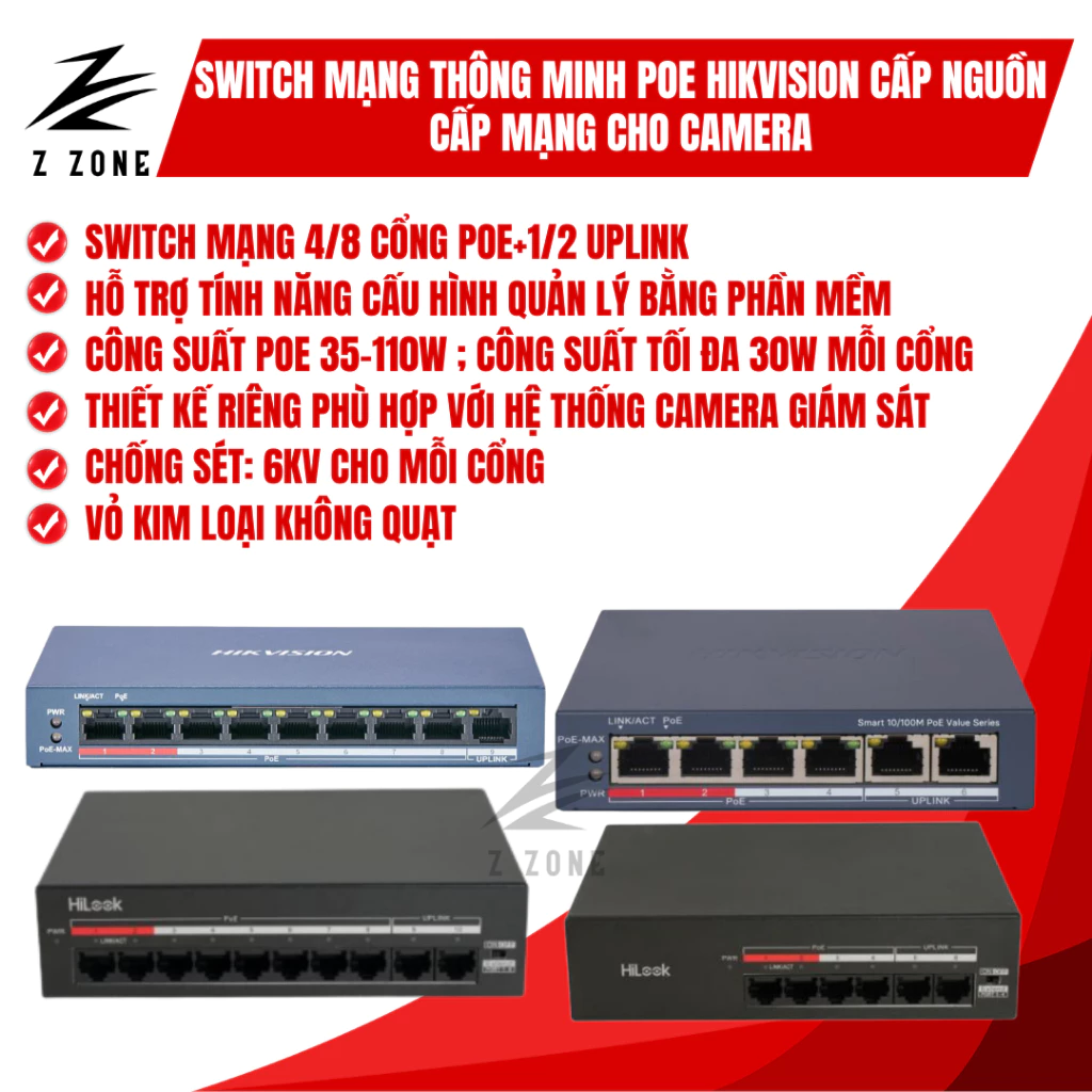 Bộ chia mạng, Switch POE HIKVISION 6 cổng, 9 cổng, 18 cổng chuyên dụng cho camera IP POE